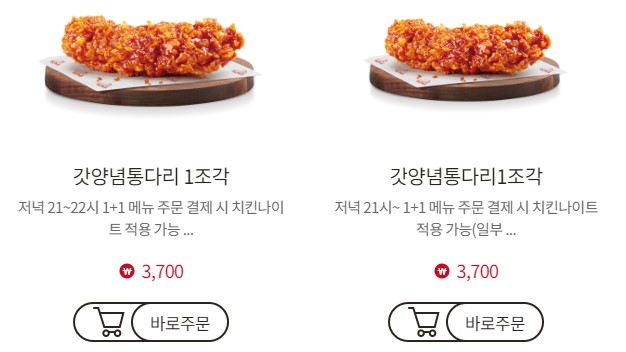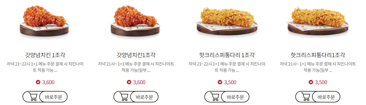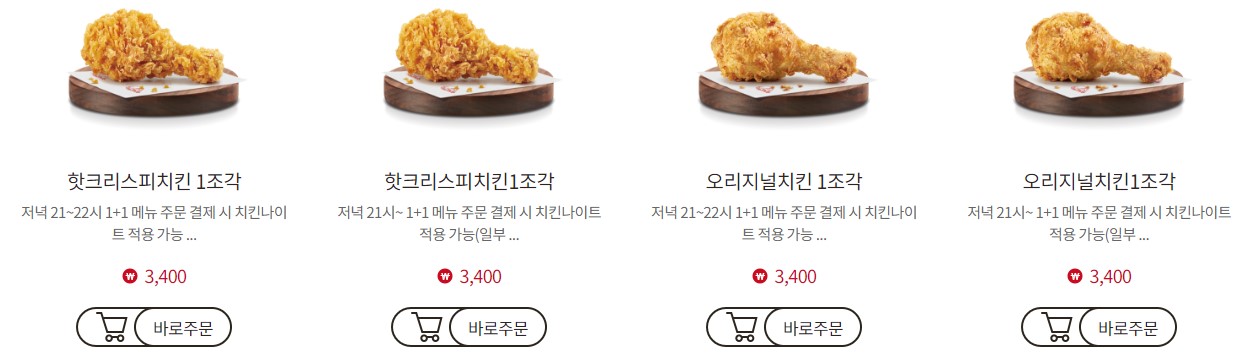 - 적용 메뉴: 1+1 표시가 된 제품에 한해 혜택이 적용되며, 일반 치킨 메뉴(1조각, 3조각, 5조각, 8조각)나 패키지 제품에는 적용되지 않습니다. 또한, 할인 상품이나 교환 쿠폰과도 중복 적용이 불가합니다.
