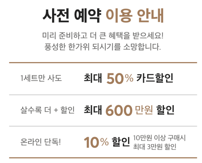 - 주요 혜택: 최대 50% 할인, 최대 120만원 상품권 증정, 무이자 혜택