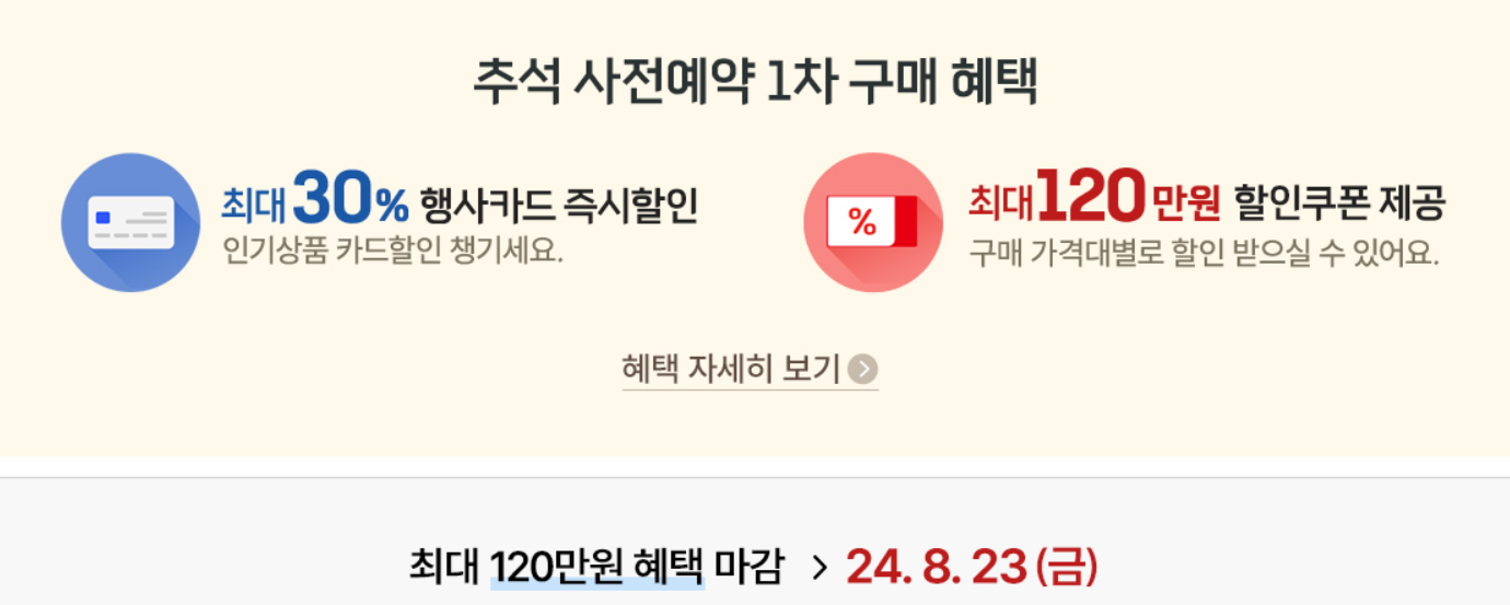 - 주요 혜택: 최대 30% 할인, 추가 포인트 적립, 최대 120만원 할인쿠폰 제공