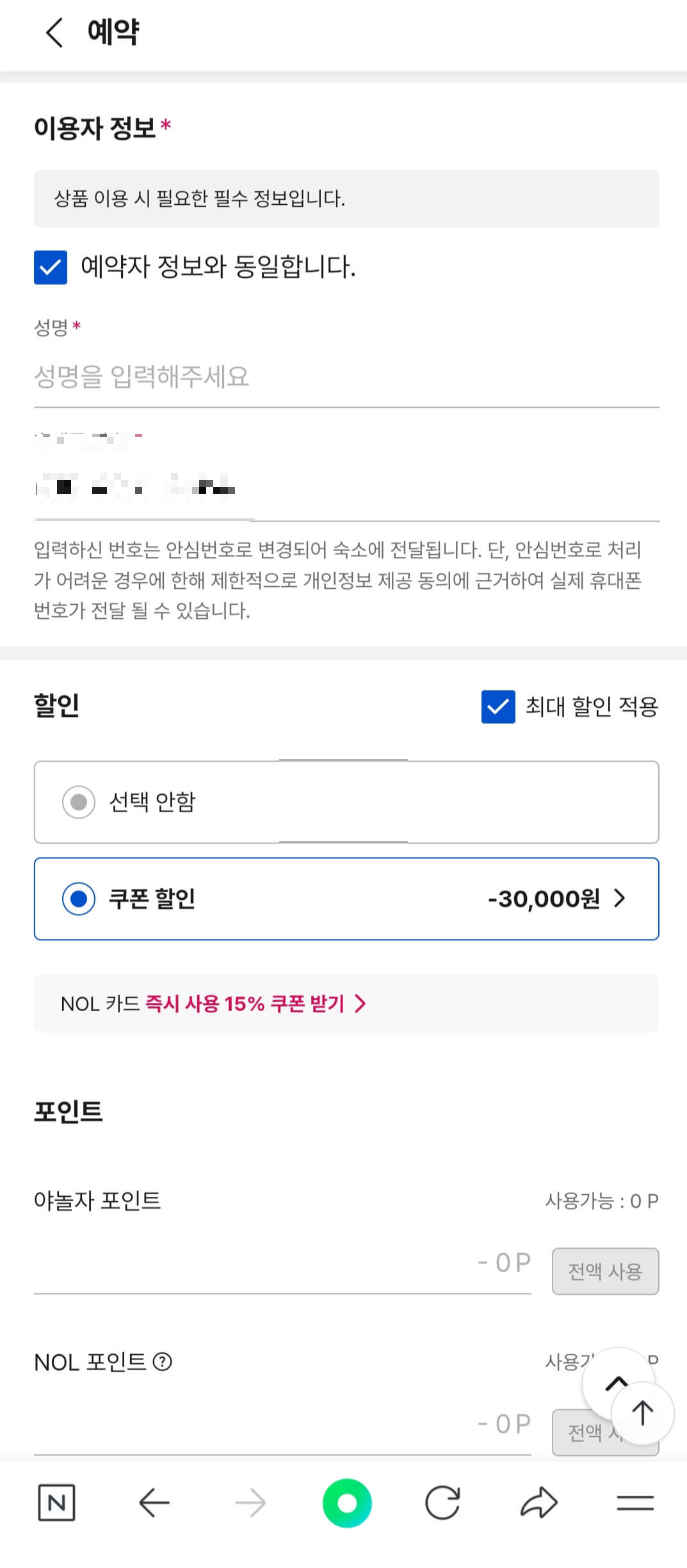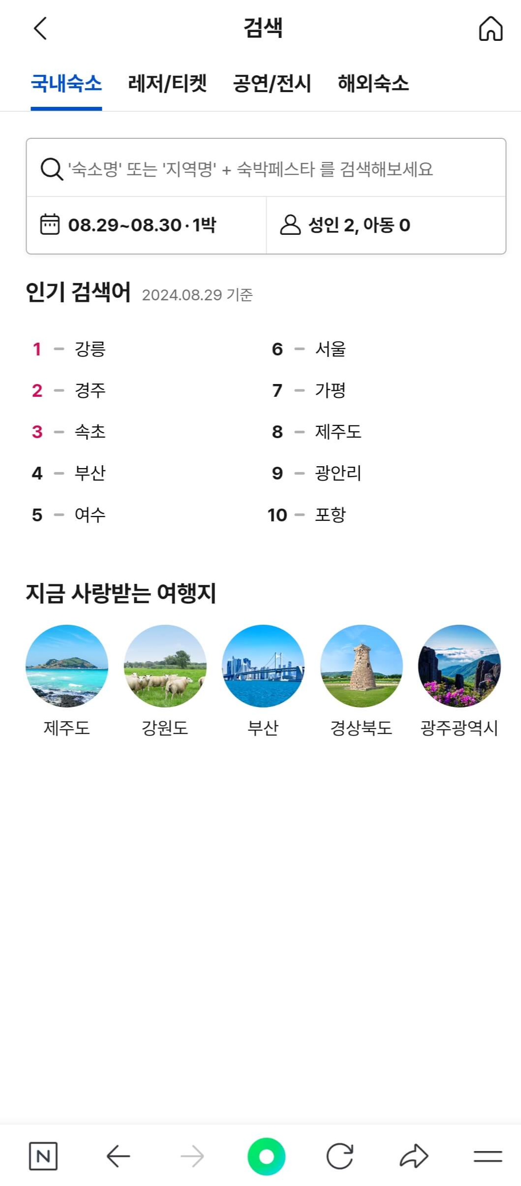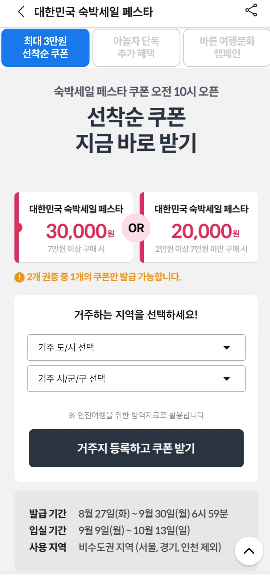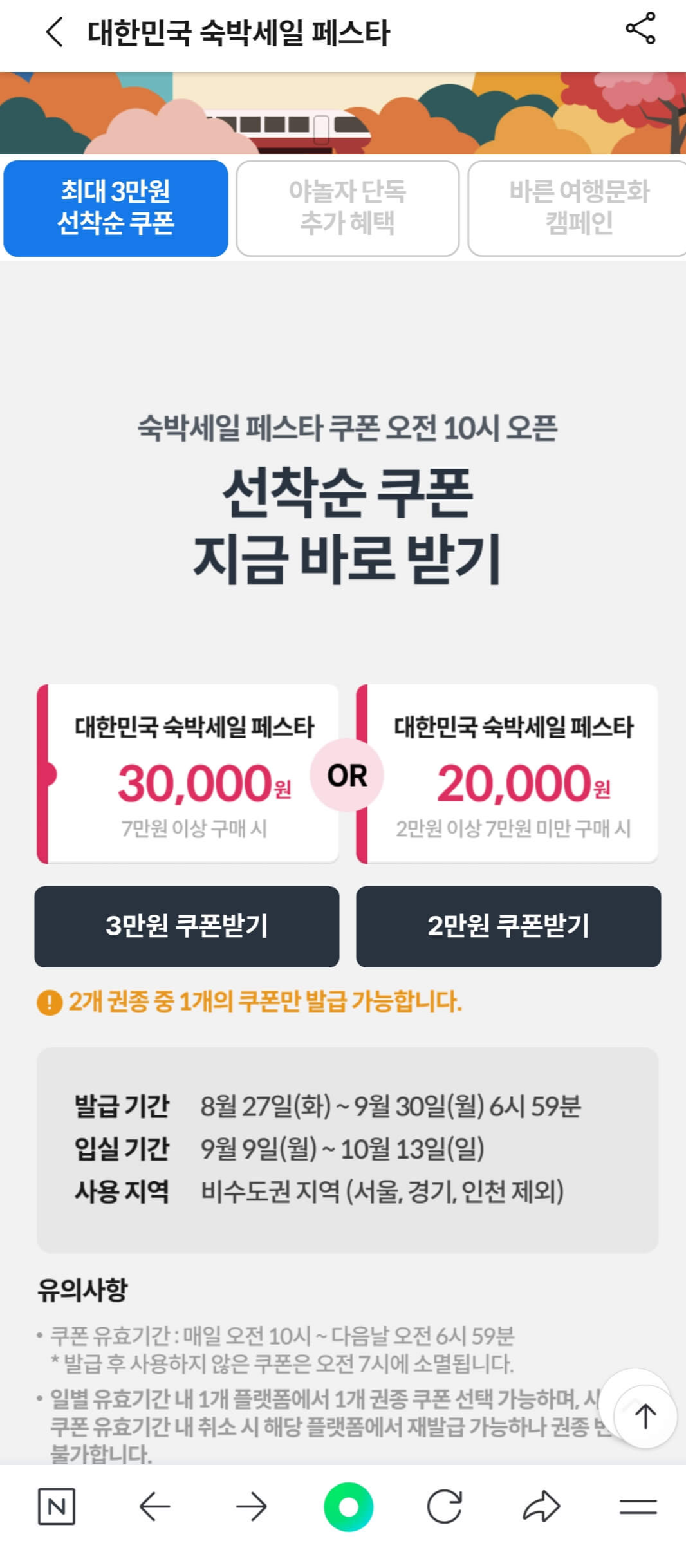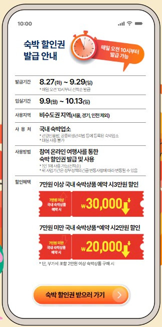 - 할인: 7만 원 이상 국내 숙박상품 예약 시 3만 원 할인, 7만 원 미만 국내 숙박상품 예약 시 2만 원의 할인