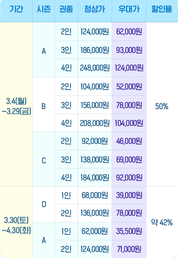 대인 종일권(4인)(A) 248,000원 → 124,000원(B) 208,000원 → 104,000원(C) 184,000원 → 92,000원