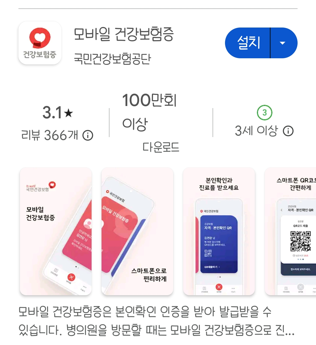 접속하여 '모바일 건강보험증'을 검색한 후 설치 합니다.