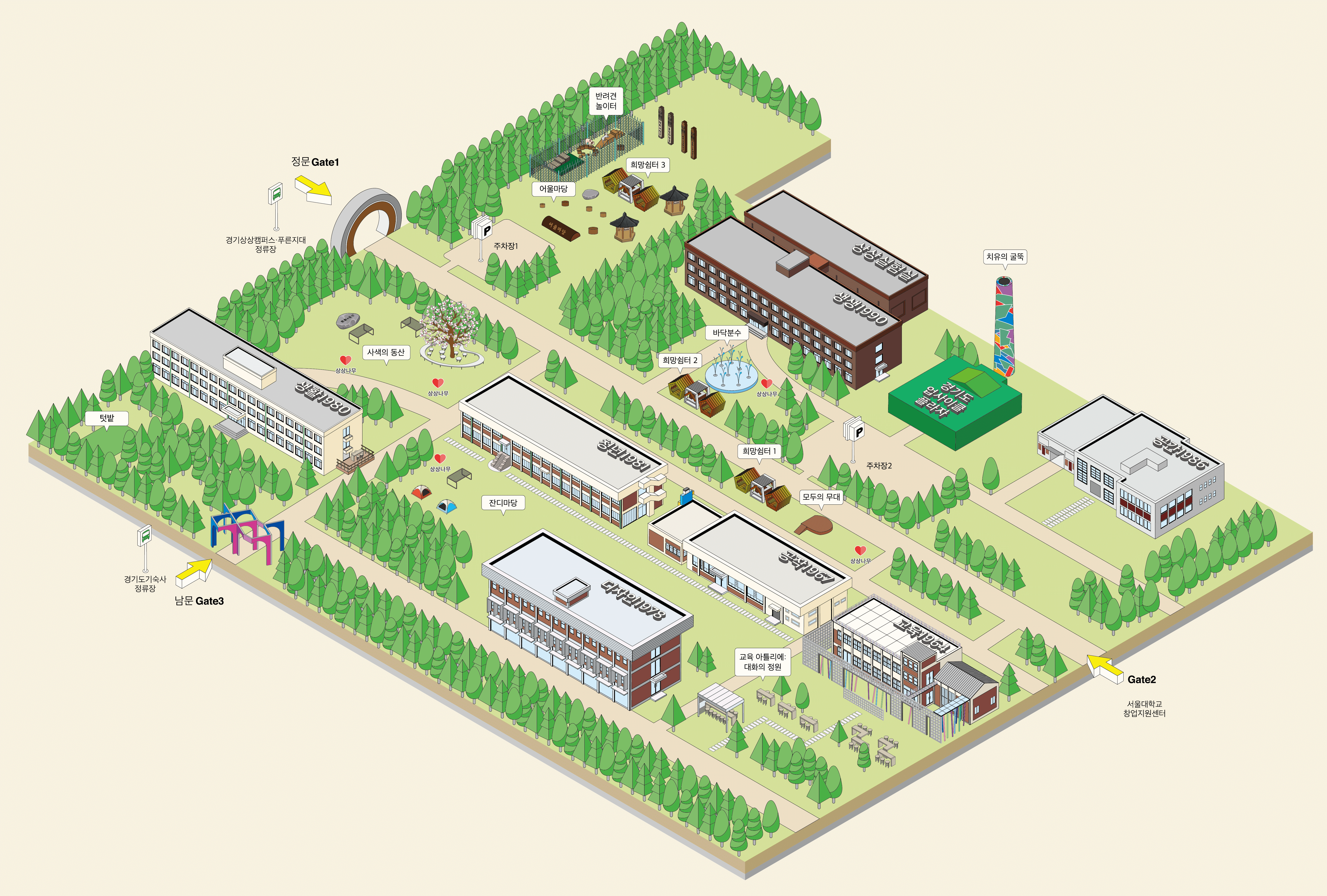 야외 숲 공간과 건물을 기반으로 현재 경기상상캠퍼스는