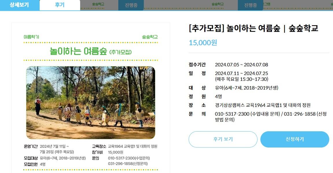 1) 놀이하는 여름숲, 숲숲학교 (유아 6~7세 대상, 2018년~19년생)