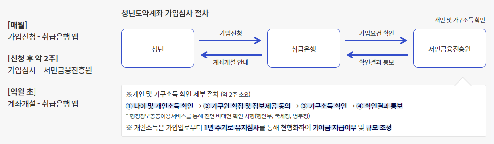 청년도약계좌의 가입 및 심사 절차는 다음과 같이 진행됩니다: