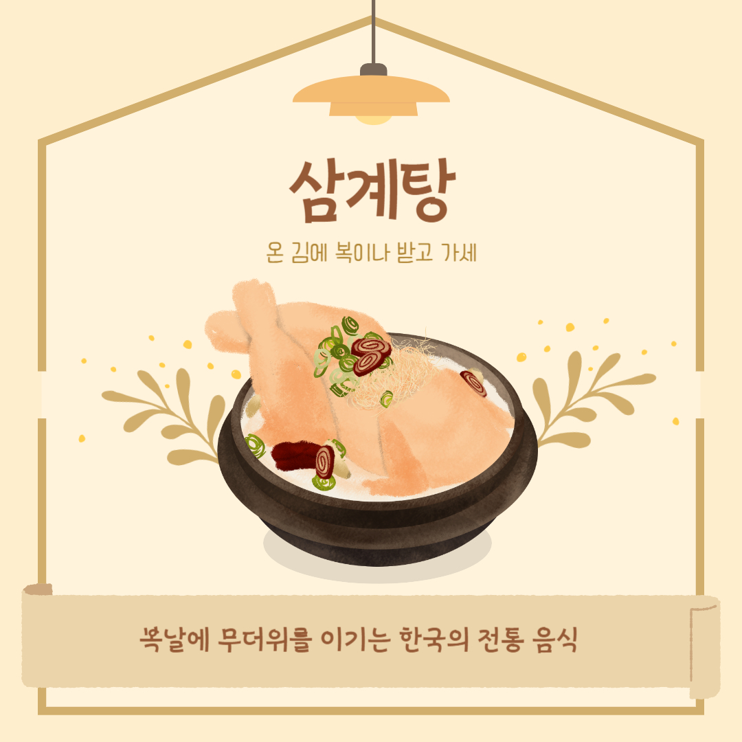 한국에서는 삼복 중 첫 번째 복날인 초복, 중간인 중복, 마지막인 말복에 삼계탕을 먹는 전통이 있습니다.