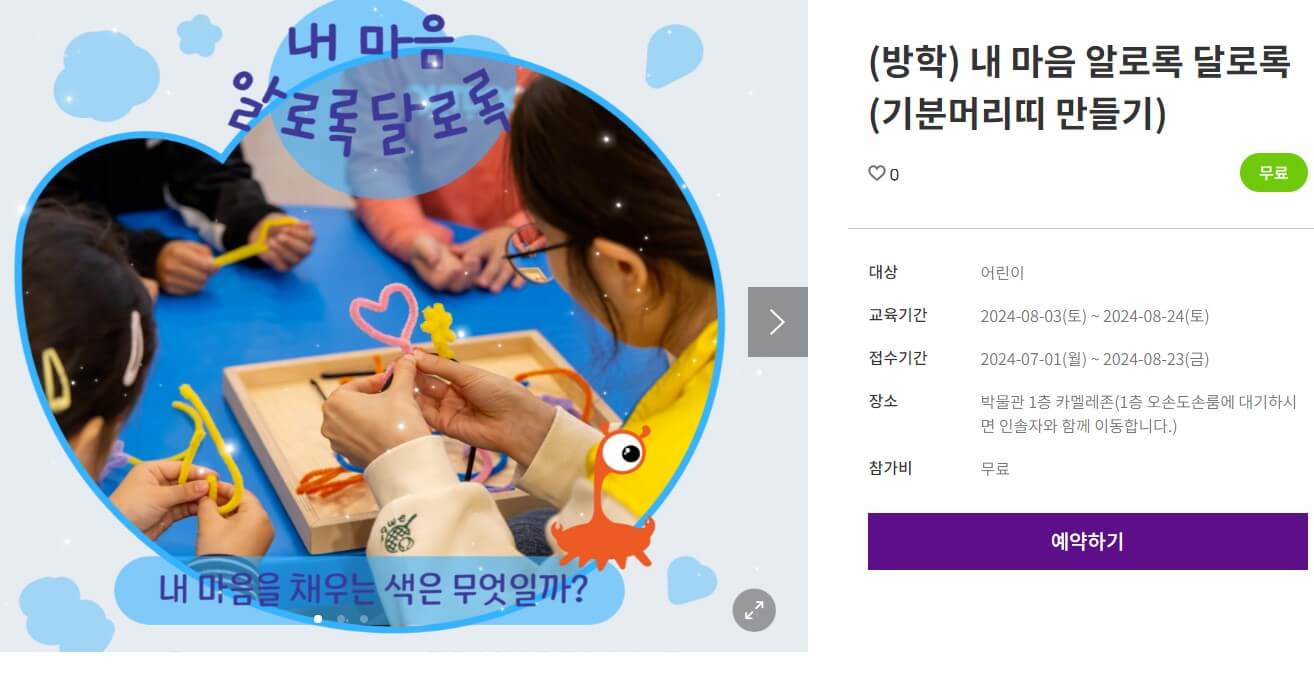 - 교육 예약과 박물관 입장권 예매는 별도입니다. 교육 프로그램을 예약하셨더라도 해당 회차의 박물관 입장권을 반드시 예매해 주셔야 합니다.