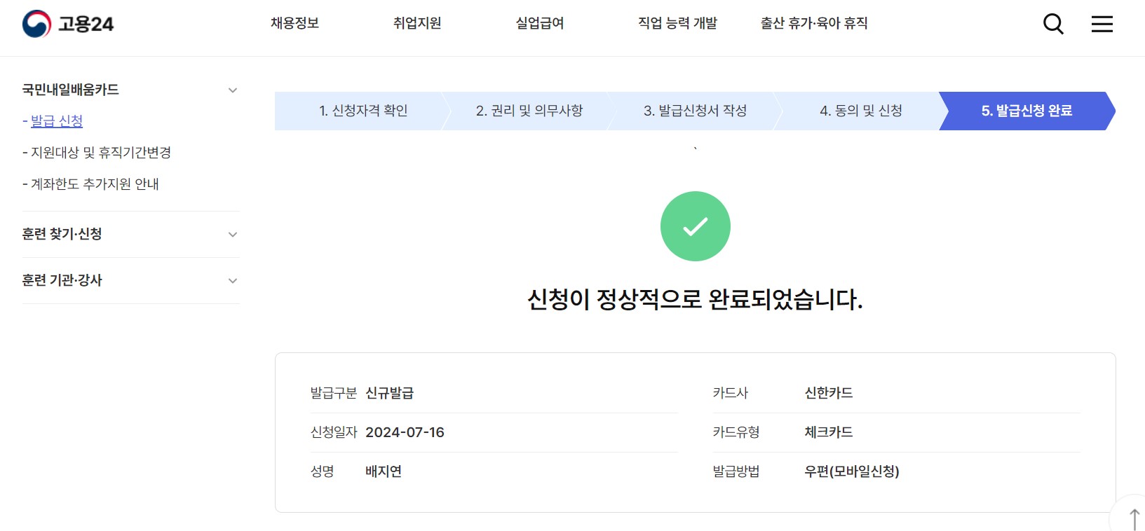 5. '신청이 정상적으로 완료되었습니다.'