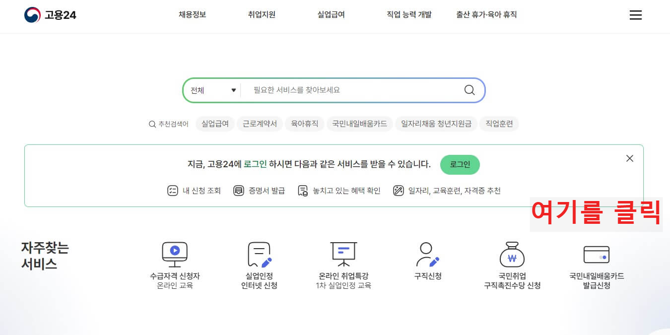 1. 고용 24 (https://www.work24.go.kr/) 에 접속 후 '국민내일배움카드' 으로 들어가기