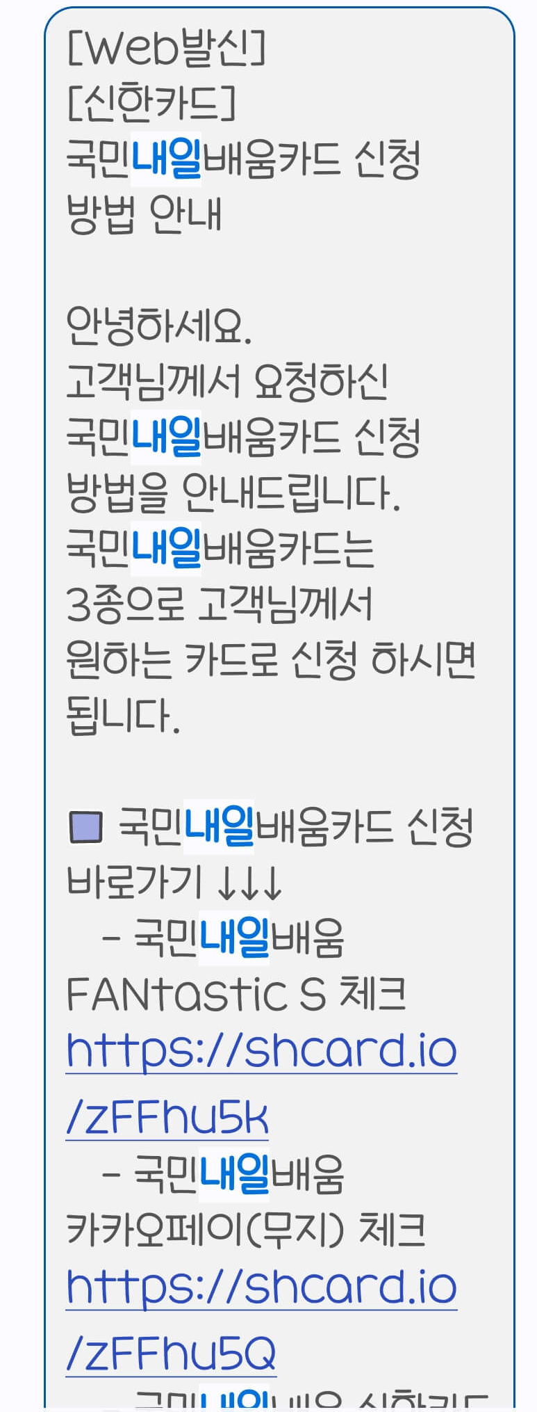 6. 정상 승인이 되면 3~4일 후에 카드사에서 원하는 카드로 신청하라고 문자가 옵니다.
